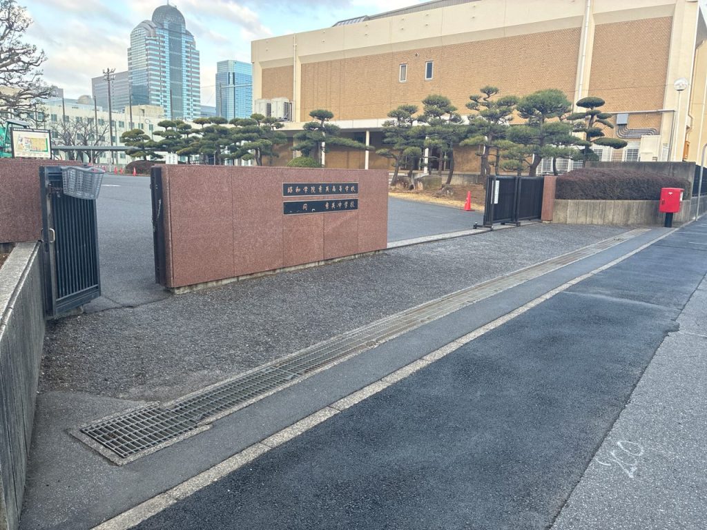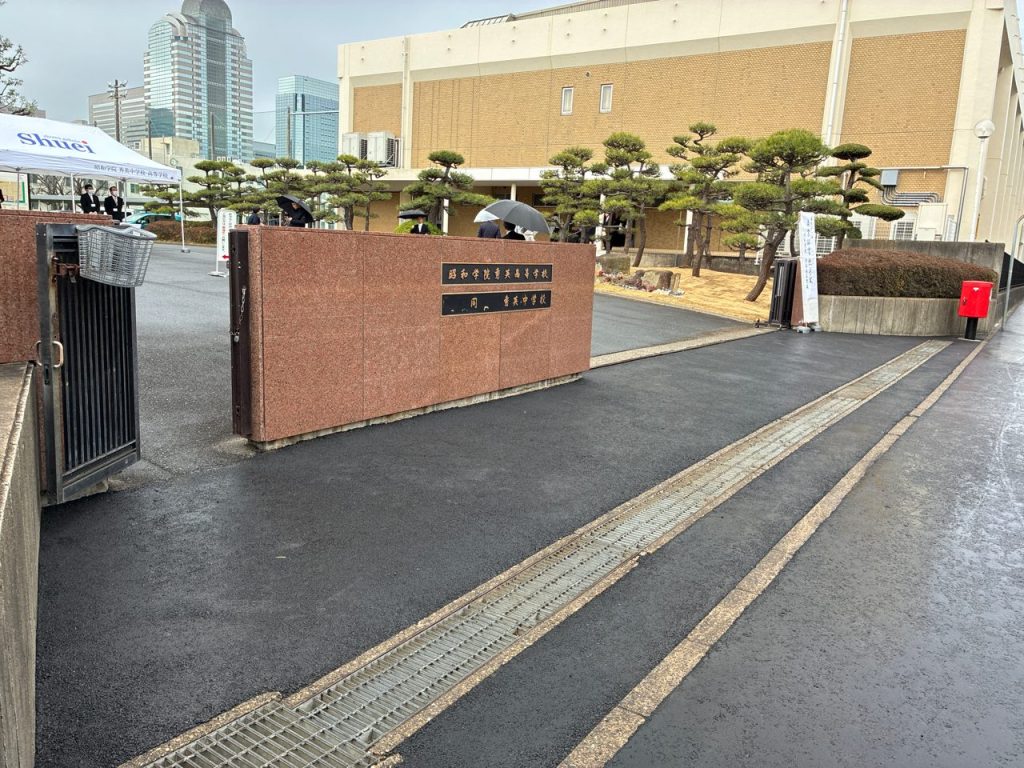 千葉市美浜区で行っている水道工事の現場で昭和学院秀英中学校・高等学校の校門部分の舗装を